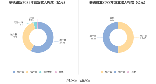 分产品来看,2023年公司主营业务中,铜产品收入27.58亿元,同比增长9.34%,占营业收入的57.60%;钴产品收入17.95亿元,同比下降29.37%,占营业收入的37.49%;电池材料收入1.81亿元,占营业收入的3.77%。