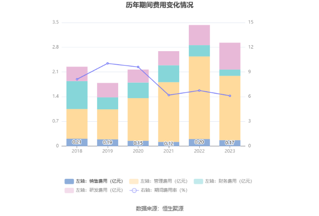 2023年,公司期间费用为2.93亿元,同比减少5061.69万元;期间费用率为6.11%,同比下降0.64个百分点。其中,销售费用同比下降14.37%,管理费用同比下降22.39%,研发费用同比增长33%,财务费用同比下降44%。