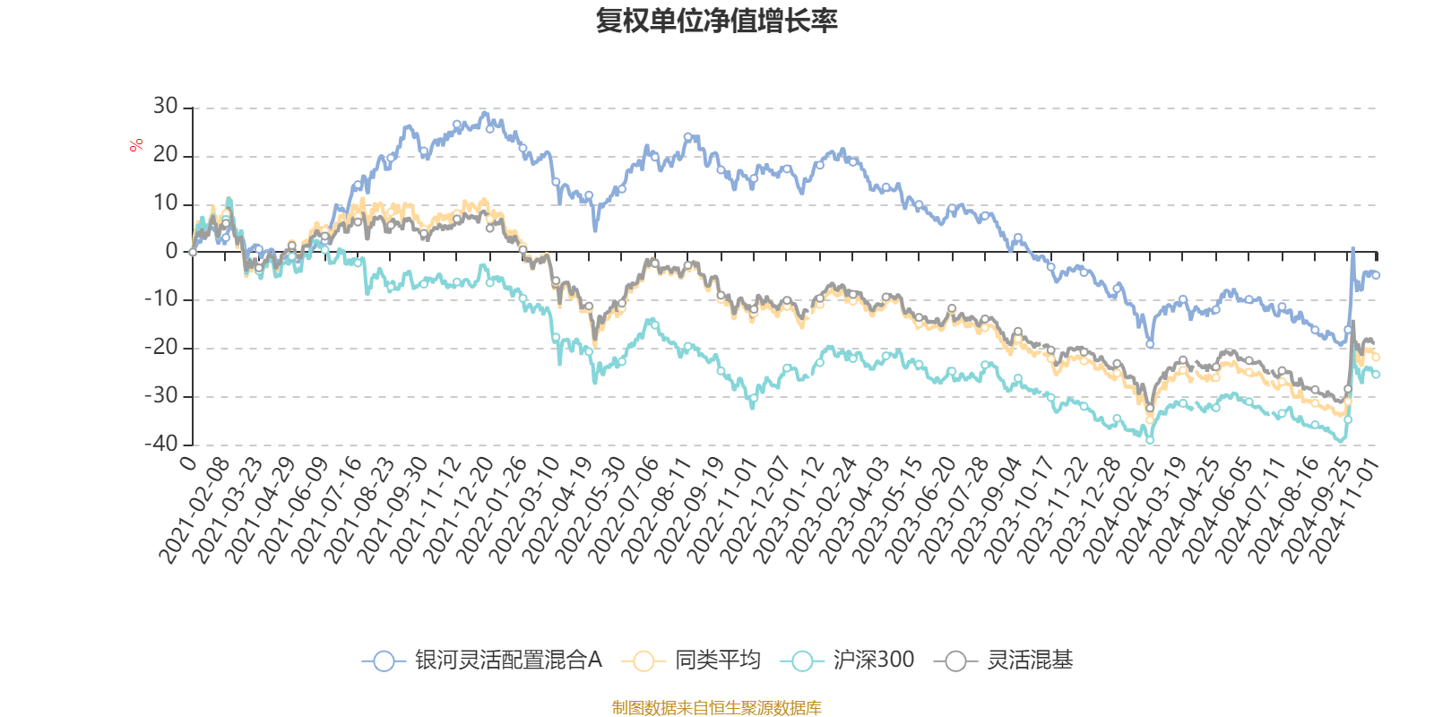 截至11月1日,银河灵活配置混合A近三个月复权单位净值增长率为8.93%,位于同类可比基金551/920;近半年复权单位净值增长率为6.65%,位于同类可比基金286/920;近一年复权单位净值增长率为-0.61%,位于同类可比基金550/920;近三年复权单位净值增长率为-23.62%,位于同类可比基金385/892。