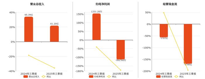 公司营业总收入为61.20亿元,较去年同报告期营业总收入减少34.19亿元,同比较去年同期下降35.84%。归母净利润为-992.60万元,较去年同报告期归母净利润减少2323.89万元,同比较去年同期下降174.56%。经营活动现金净流入为-8.90亿元,较去年同报告期经营活动现金净流入减少5.89亿元。