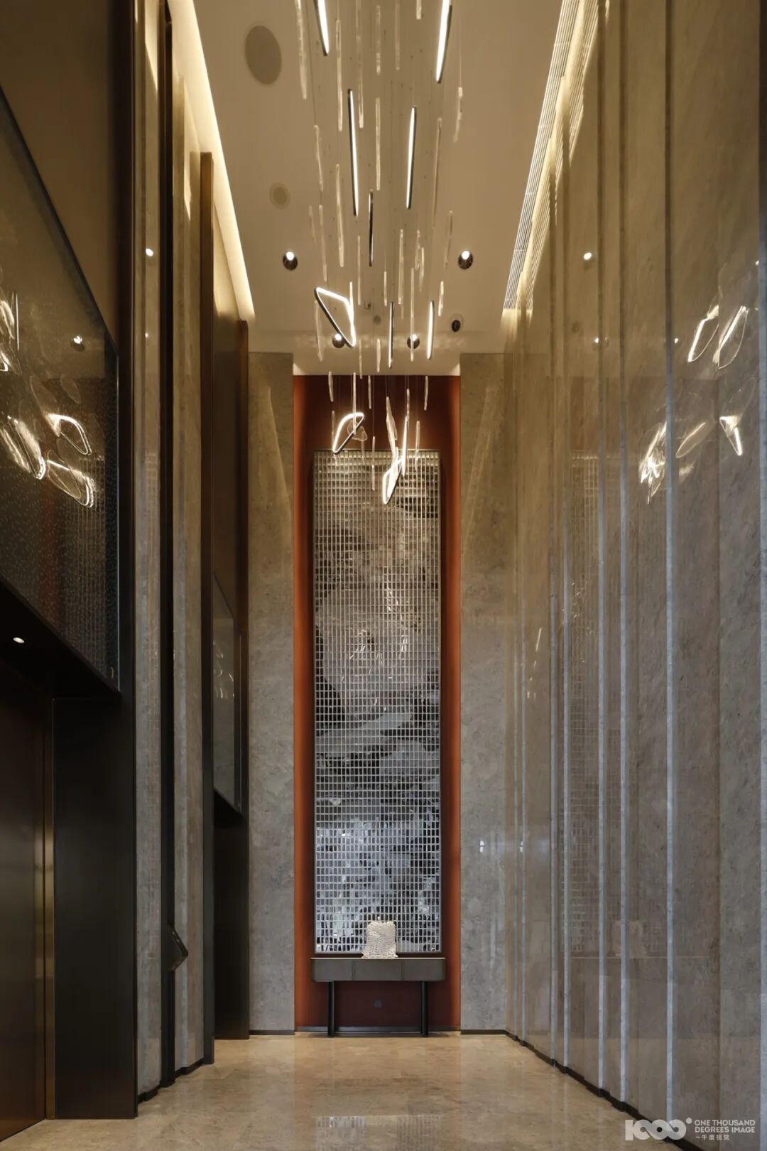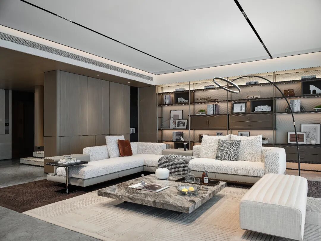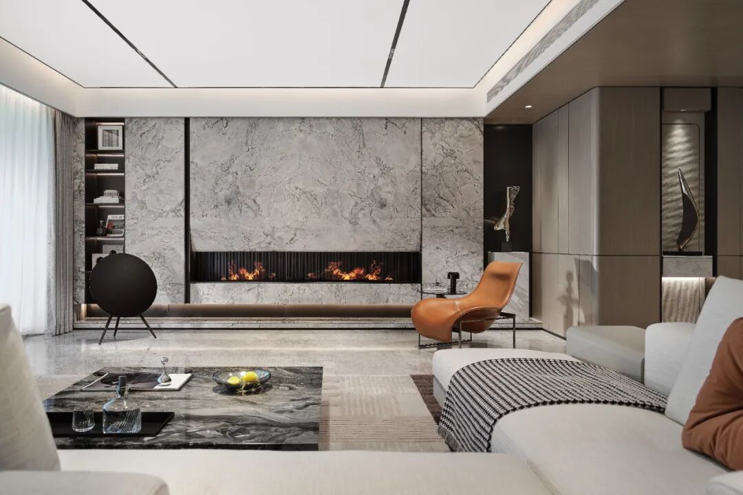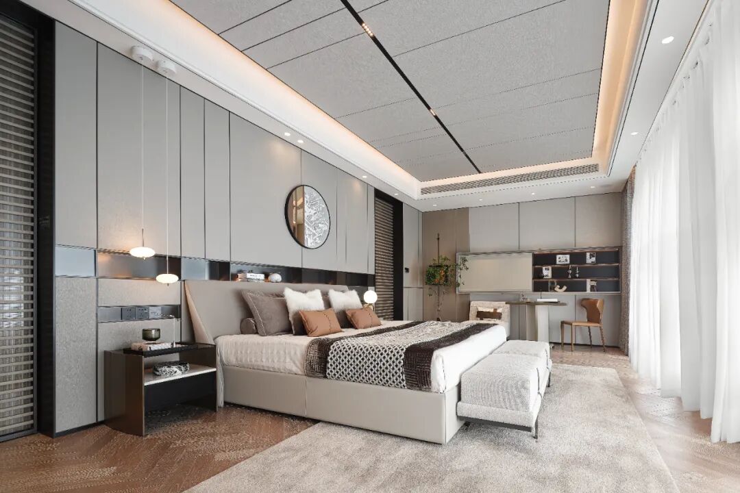设计从江湖水系的自然形态中提取语言,通过流线型的结构布局与不对称的空间构图,模拟水波的起伏与流动。镜面与透光材质的运用,进一步强化了光与影的互动,仿佛水面粼粼的微光被引入室内。色调上以灰与棕为主旋律——灰调象征城市的现代肌理,棕调承载土地的自然记忆,二者在冷暖材质的搭配中和谐相融,兼顾视觉美学与人体工程学的舒适体验。