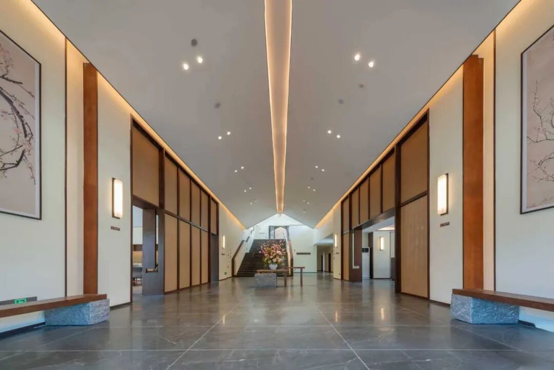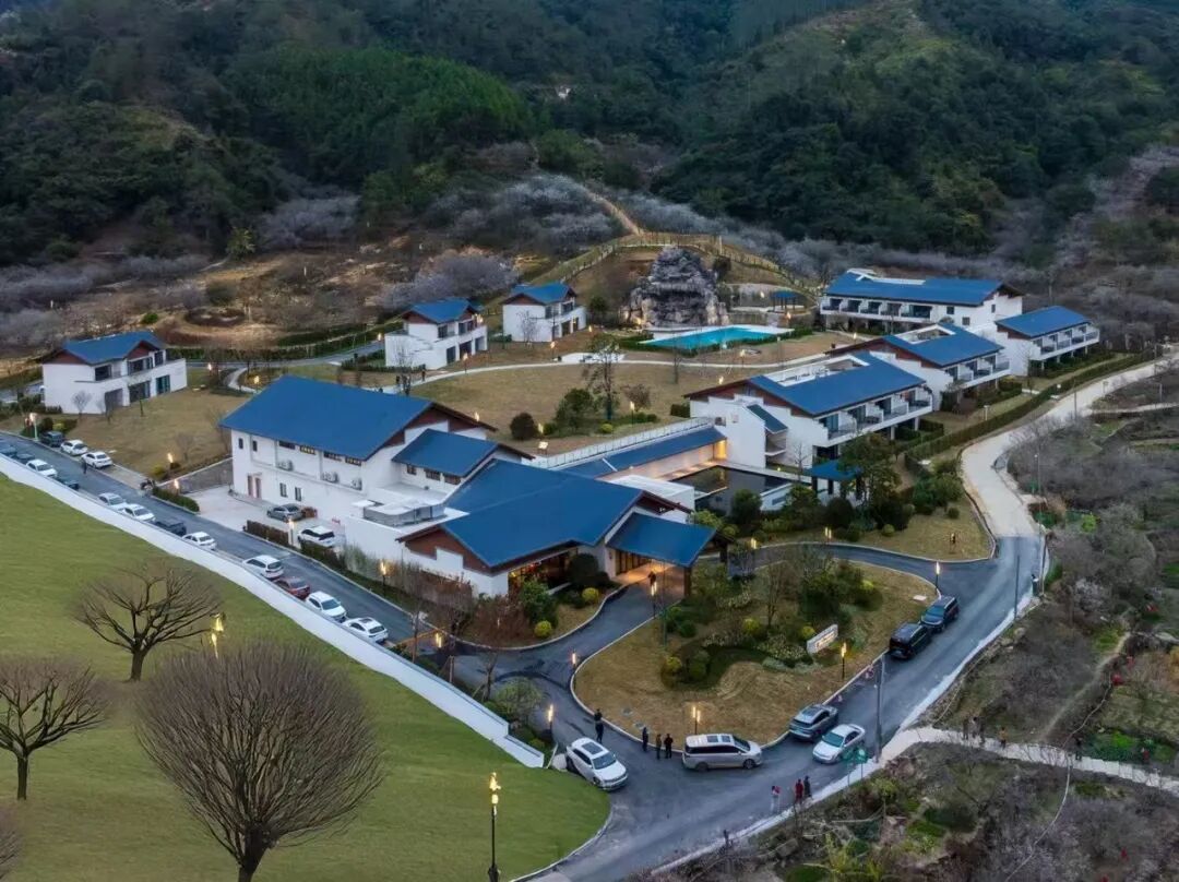 美华设计负责本项目建筑、景观、装饰及软装等全专业设计任务。建筑设计采用中式传统民居风格,整体布局打造村落的自然场景,形成掩映在梅林中的田园风光,最大化利用周边景观,视线不对场地内部产生过多影响,建设开敞、平坦的四季常青户外大草坪,用于举办拓展、会议、婚庆等活动,同时可作为赏梅的观景平台。