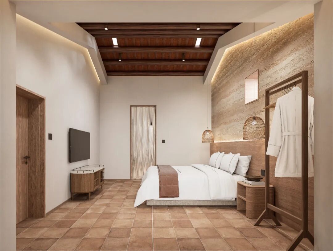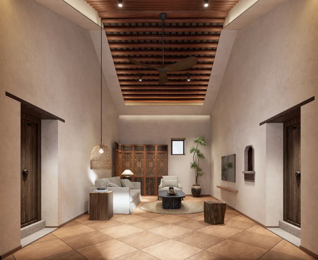 设计保留原有夯土墙体、木构屋架等乡土肌理,并融入现代材料与工艺进行结构加固与空间激活,形成历史与现代的对话。通过院落景观的重新梳理与多维感官体验的营造,打造集居住、游览、文化体验与在地消费于一体的乡村生活综合体。
