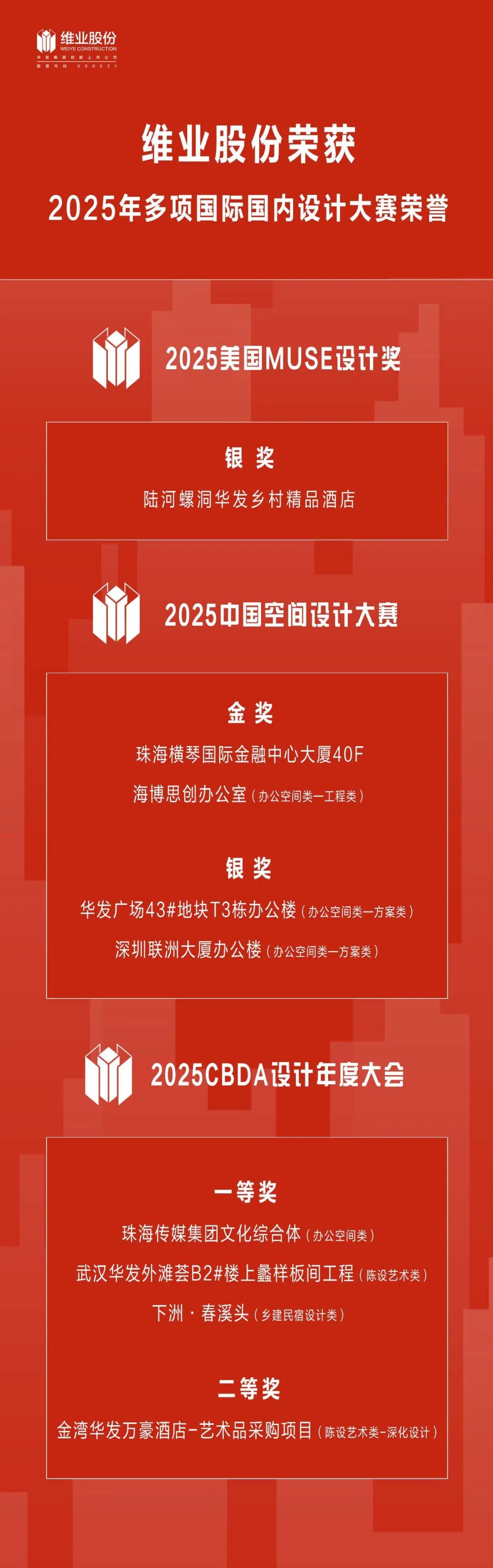 在2025年CBDA设计年度大会上,维业股份下属美华设计的设计作品凭借独特的创意、深厚的文化内涵与专业的表现,荣获3个一等奖、1个二等奖的荣誉佳绩。