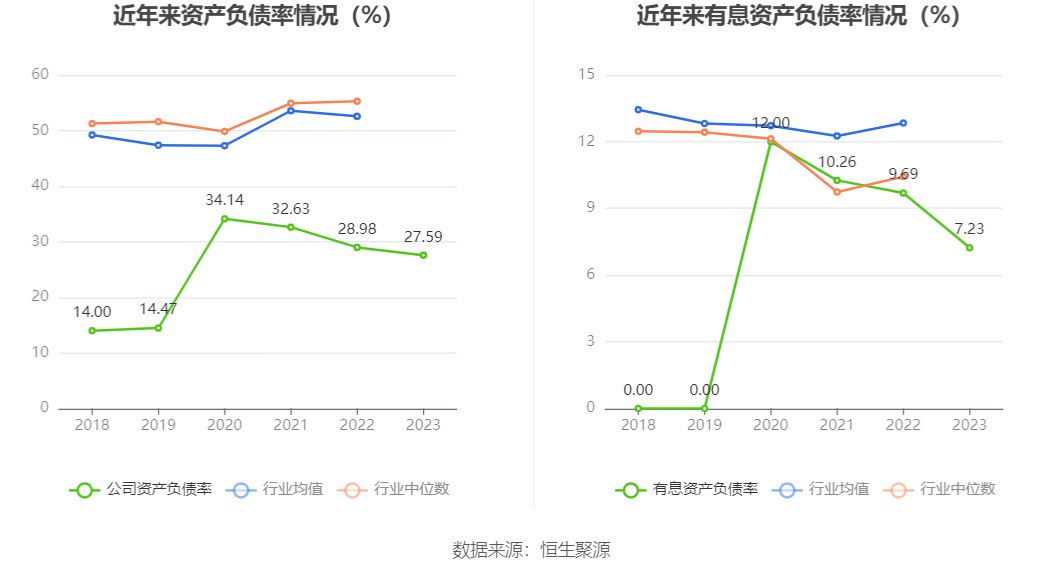 在偿债能力方面,公司2023年年末资产负债率为27.59%,相比上年末下降1.39个百分点;有息资产负债率为7.23%,相比上年末下降2.46个百分点。