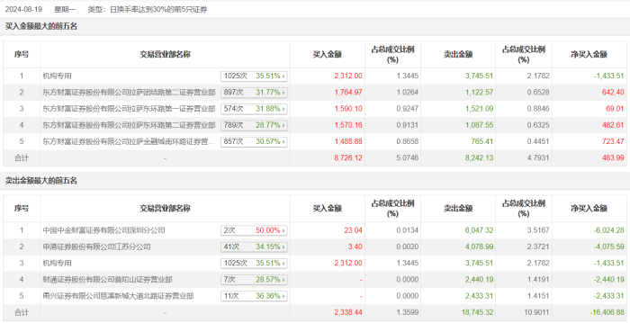 博士眼镜今日跌超11%,成交额17.20亿元,换手率43.24%,盘后龙虎榜数据显示,买入金额8752.55万元,卖出金额2.32亿元。具体来看,一机构专用席位净卖出1433.51万元,“拉萨天团”占据买方四席位。