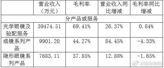公司产品结构丰富多样,通过线上线下一体化方式销售光学眼镜及验配服务(镜架、镜片和验配服务)、成镜系列产品(太阳镜、老花镜等)、隐形眼镜系列产品(软、硬性隐形眼镜、护理液)及眼健康周边产品。2023年上半年,公司主营业务及主要产品未发生重大变化。其中,公司光学眼镜及验配服务实现营业收入39474.51万元,同比增长26.37%。