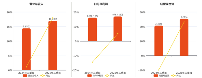公司营业总收入为10.80亿元,在已披露的同业公司中排名第6。归母净利润为8783.13万元。经营活动现金净流入为2.78亿元,在已披露的同业公司中排名第4。