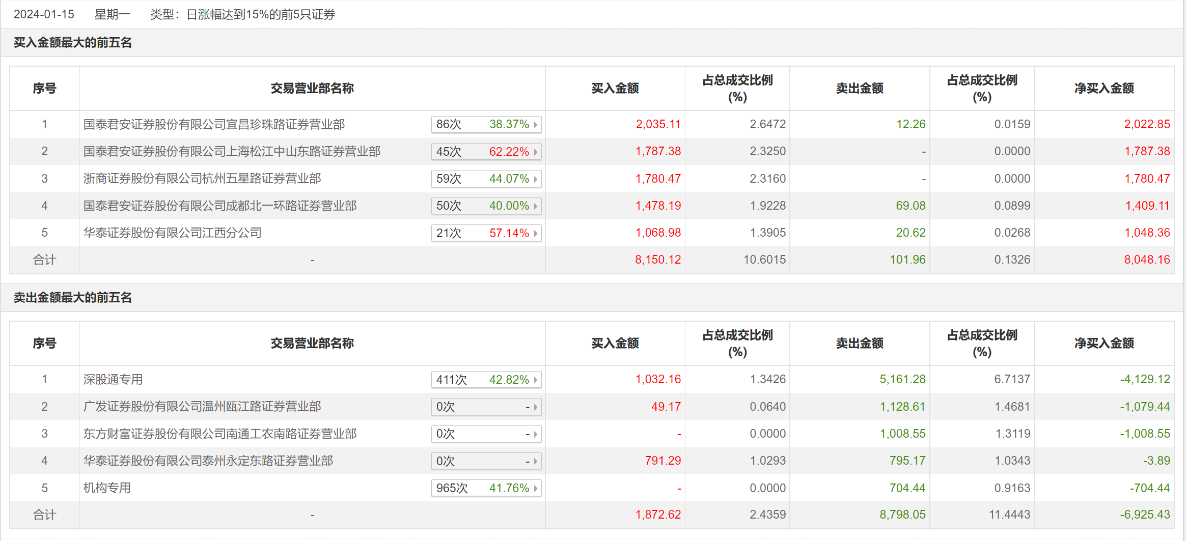 1月15日,捷捷微电今日涨16.18%,全天换手率达7.25%,振幅达19.26%。龙虎榜数据显示,营业部席位合计净买入1122.74万元。其中,机构合计净卖出704.44万元。此外,国泰君安证券宜昌珍珠路证券营业部、国泰君安证券上海松江中山东路证券营业部分别买入2035.11万元、1787.38万元;深股通专用、广发证券温州瓯江路证券营业部分别卖出5161.28万元、1128.61万元。