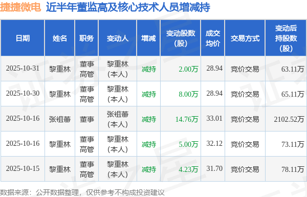 捷捷微电:10月31日高管黎重林减持股份合计2万股