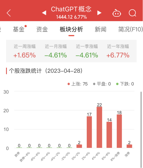 中国经济网北京4月28日讯今日,ChatGPT概念板块整体涨幅6.77%,其中,75只股票上涨,0只股票平盘,0只股票下跌。