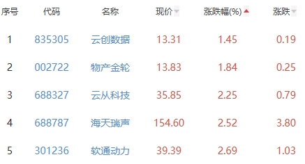 云创数据、物产金轮、云从科技、海天瑞声、软通动力位列涨幅榜后五位,涨幅分别为1.45%、1.84%、2.25%、2.52%、2.69%。