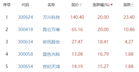 其中,万兴科技、昆仑万维、彩讯股份、蓝色光标、世纪天鸿位列板块涨幅前五位,涨幅分别为20.00%、20.00%、18.41%、16.79%、15.27%。