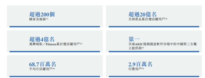 万兴科技在深圳、长沙、拉萨、北京、杭州、温哥华、东京等地设立运营中心,持续深拓数字创意版图,业务范围遍及200多个国家和地区。截至最后实际可行日期,公司全部产品累计总活跃用户超过20亿名;截至2025年6月30日止六个月,公司平均月活跃用户6870万名,付费用户290万名。