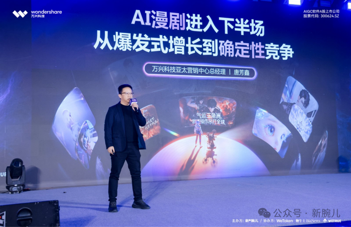 在这场会上,万兴科技亚太营销中心总经理唐芳鑫在台上发表围绕《AI漫剧进入下半场,从爆发式增长到确定性竞争》的主题演讲。他指出,AI漫剧赛道已全面爆发,这不只是内容热度的提升,更意味着生产力的成熟,行业竞争正走向确定性。