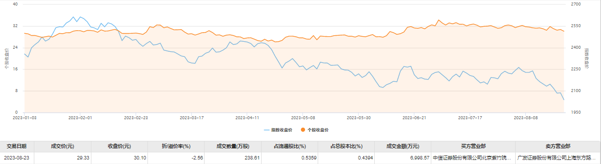 8月23日大宗交易成交238.61万股,成交额6998.57万元,占当日总成交额的50.47%,成交价29.33元,较市场收盘价30.1元折价2.56%。