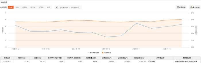 今日大宗交易成交369.47万股,成交额1.4亿元,占当日总成交额的21.01%,成交价37.9元,较市场收盘价折价6.99%。