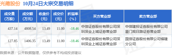10月24日光莆股份现2笔折价18.46%的大宗交易 合计成交6214.89万元