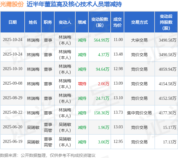 光莆股份近半年内的董监高及核心技术人员增减持详情如下: