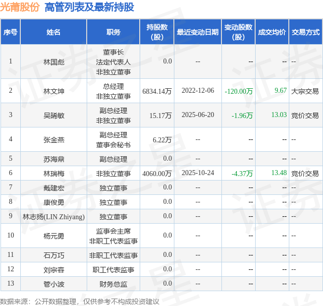 证券之星消息,根据10月27日市场公开信息、上市公司公告及交易所披露数据整理,光莆股份(300632)最新董监高及相关人员股份变动情况:2025年10月24日公司董事林瑞梅共减持公司股份569.36万股,占公司总股本为1.8656%。变动期间公司股价上涨2.12%,10月24日当日收盘报13.49元。