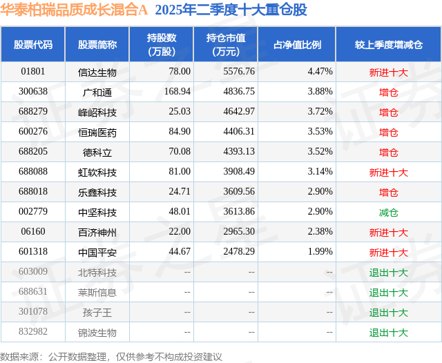 华泰柏瑞品质成长混合A的前十大重仓股如下: