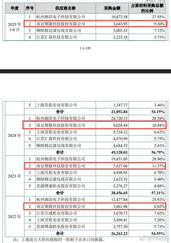 采购额与南京聚隆销售额不一致。报告期内,南京聚隆科技股份有限公司(南京聚隆)均位列朗信电气前五供应商之列,采购额分别为3,861.96万元、7,627.06万元、9,028.44万元、3,643.95万元。