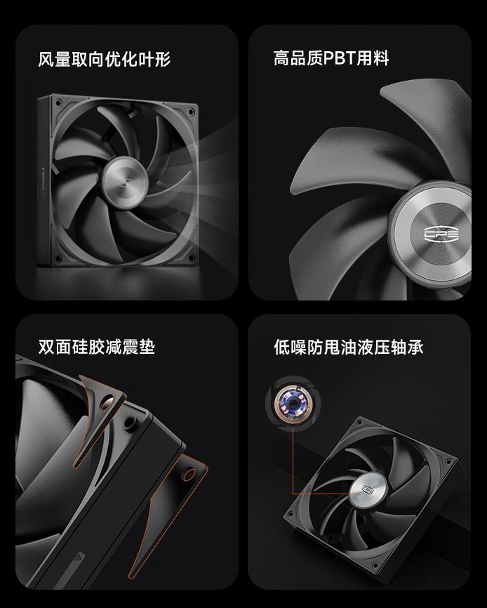 这款风扇造型简洁,采用风量取向优化叶形设计,风扇轴心提供星环金属 CD 纹理,扇叶采用加厚加强型的 PBT 材质打造,风扇内部使用低噪音防甩油液压轴承。