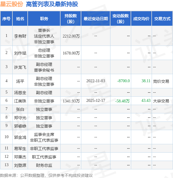 星云股份的高管列表及最新持股情况如下: