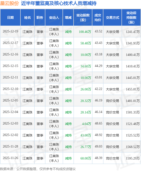 星云股份近半年内的董监高及核心技术人员增减持详情如下:
