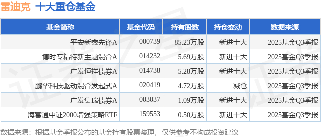 根据2025基金Q3季报公募基金重仓股数据,重仓该股的公募基金共6家,其中持有数量最多的公募基金为平安基金的平安新鑫先锋A。平安新鑫先锋A目前规模为8.51亿元,最新净值2.633(11月4日),较上一交易日下跌1.97%,近一年上涨29.35%。该公募基金现任基金经理为张晓泉。张晓泉在任的基金产品包括:平安研究精选混合A,管理时间为2021年5月25日至今,期间收益率为29.83%;平安研究优选混合A,管理时间为2023年3月21日至今,期间收益率为34.68%;平安新鑫优选混合A,管理时间为2023年8月15日至今,期间收益率为45.14%。