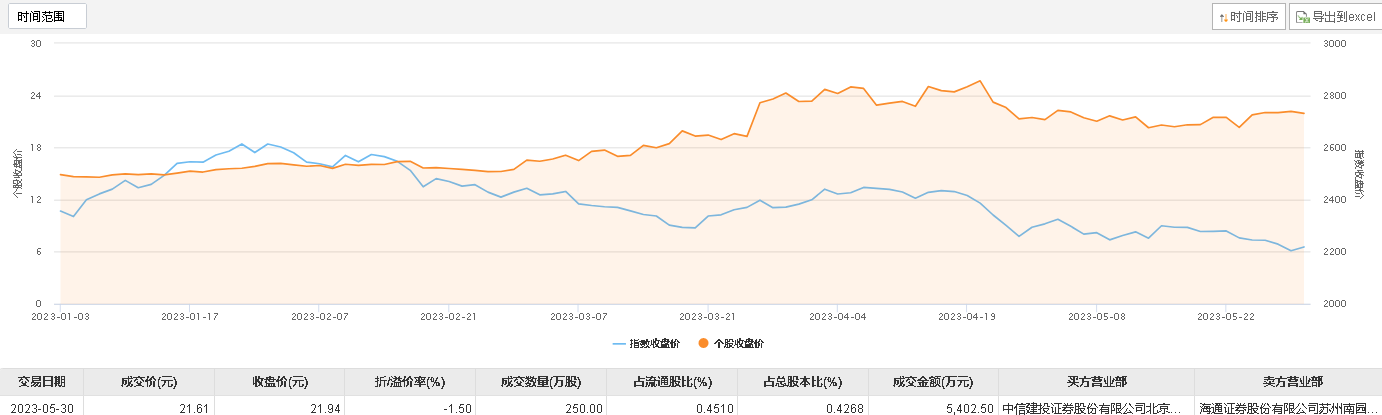 5月30日大宗交易成交250万股,成交额5402.5万元,占当日总成交额的8.96%,成交价21.61元,较市场收盘价21.94元折价1.5%。