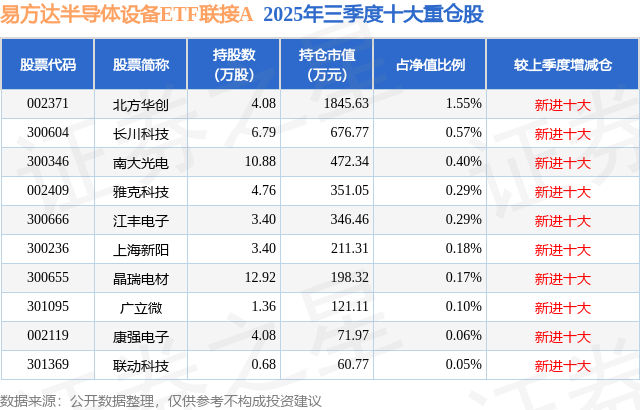 根据2025基金Q3季报公募基金重仓股数据,重仓该股的公募基金共1家,其中持有数量最多的公募基金为易方达基金的易方达半导体设备ETF联接A。易方达半导体设备ETF联接A目前规模为2.42亿元,最新净值1.5133(1月6日),较上一交易日上涨3.67%,近一年上涨70.57%。该公募基金现任基金经理为李树建。李树建在任的基金产品包括:易方达创业板中盘200ETF,管理时间为2023年12月15日至今,期间收益率为51.07%;易方达上证科创板成长ETF联接发起式A,管理时间为2024年1月4日至今,期间收益率为119.77%;易方达信创ETF联接A,管理时间为2024年1月5日至今,期间收益率为85.74%;易方达机器人ETF联接A,管理时间为2024年5月21日至今,期间收益率为55.27%。