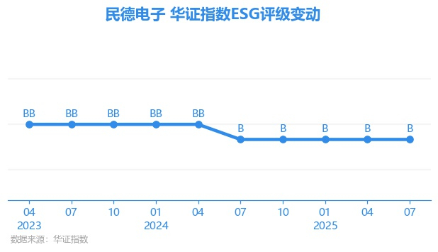 从细项得分来看,民德电子E项得分65.17,评级为CCC,行业内排名302/529(E项目评分维度包括气候变化、资源利用、环境污染、环境友好、环境管理);S项得分80.2,评级为BBB,行业内排名280/529(S项目评分维度包括人力资本、产品责任、供应商、社会贡献);G项得分76.21,评级为BB,行业内排名421/529(G项目评分维度包括股东权益、治理结构、信披质量、治理风险、外部处分、商业道德)。