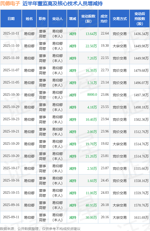 民德电子近半年内的董监高及核心技术人员增减持详情如下: