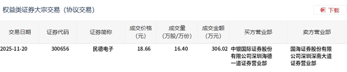 11月20日,民德电子大宗交易成交16.4万股,成交额306.02万元,占当日总成交额的5.81%,成交价18.66元,较市场收盘价22.03元折价15.3%。