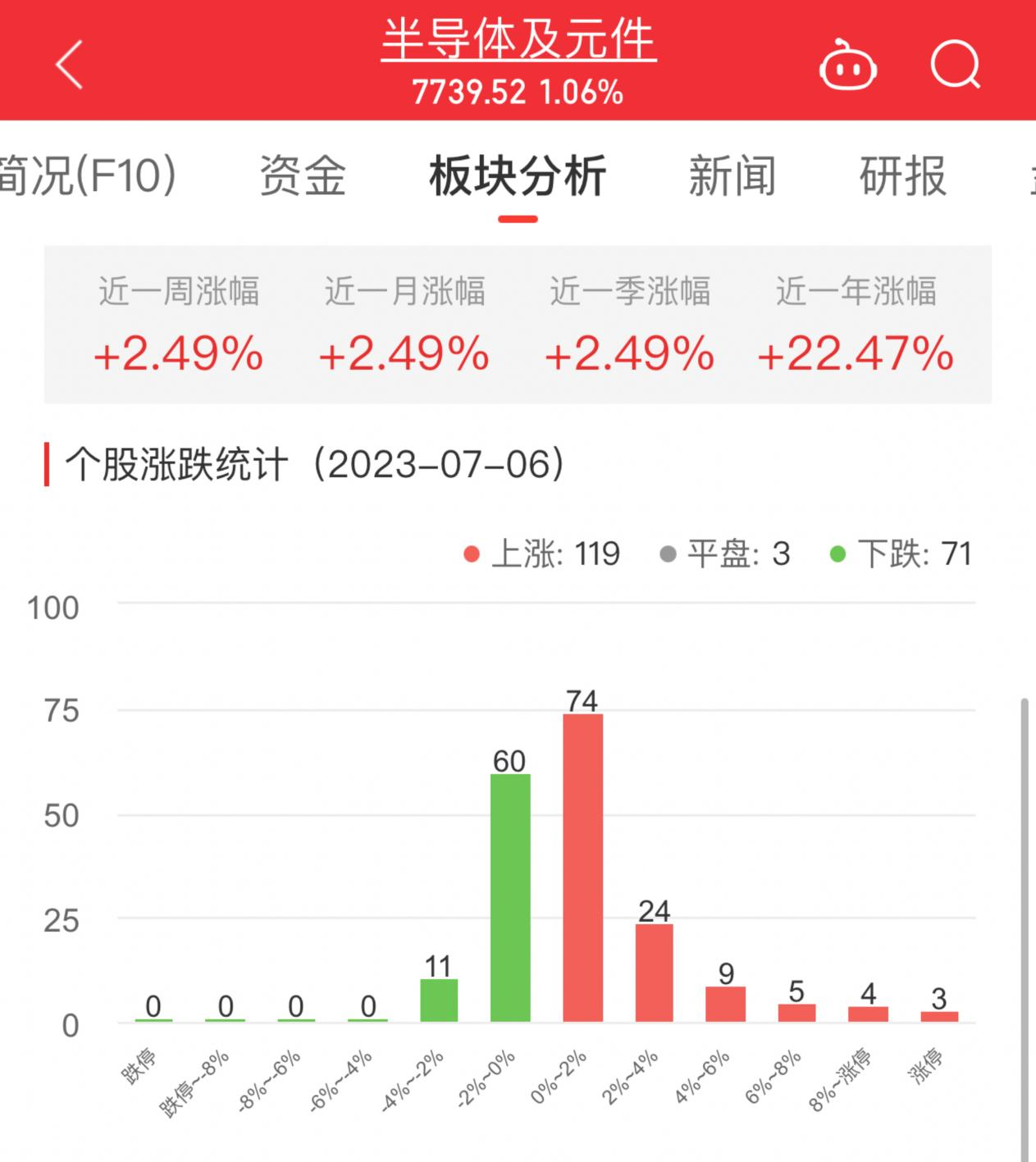 中国经济网北京7月6日讯 今日,半导体及元件板块整体涨幅1.06%,其中119只股票上涨,3只股票平盘,71只股票下跌。