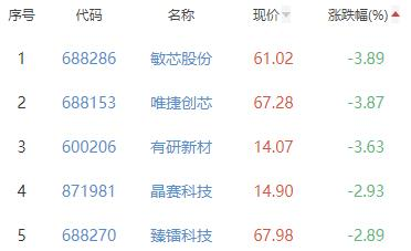 敏芯股份、唯捷创芯、有研新材、晶赛科技、臻镭科技位列涨幅榜后五位,涨幅分别为-3.89%、-3.87%、-3.63%、-2.93%、-2.89%。