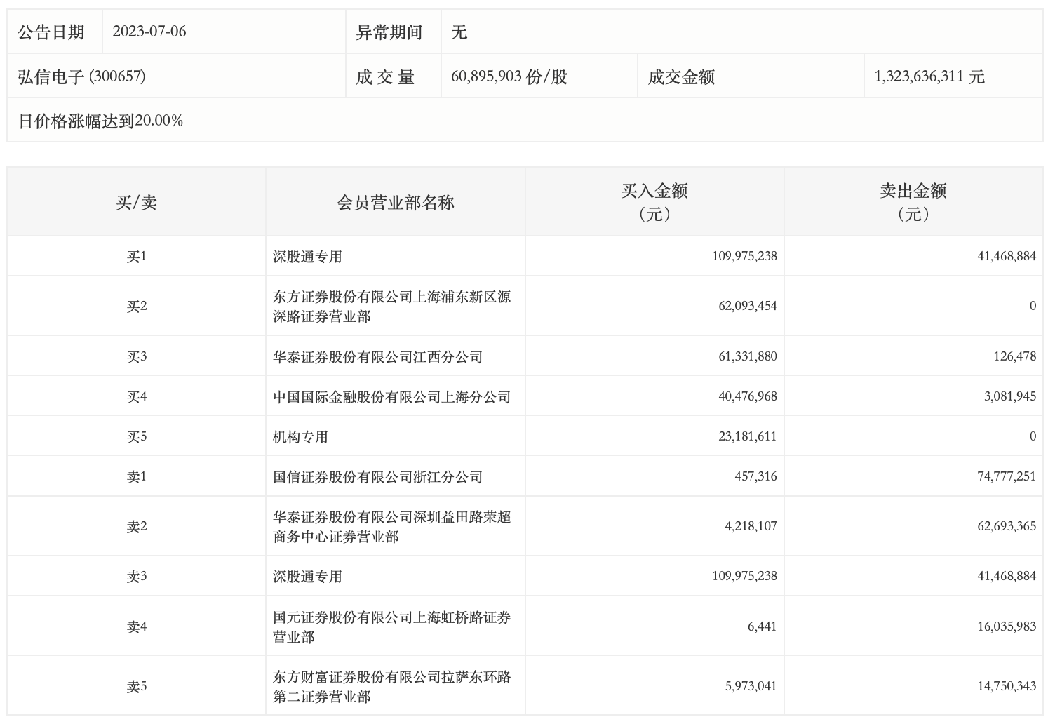7月6日,弘信电子今日涨停,龙虎榜数据显示,上榜营业部席位全天成交5.21亿元,占当日总成交金额比例为39.33%。其中,买入金额为3.08亿元,卖出金额为2.13亿元,合计净买入9477.98万元。