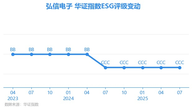 日前,华证指数公布了新一期(2025年7月31日)的ESG评级结果,弘信电子(300657.SZ)获得CCC评级(华证指数评级为C起至AAA九档,C为最低档,AAA为其最高一级评级/AA为其第二档),上一期(2025年4月30日)ESG评级为CCC。本期ESG评级在529家电子设备、仪器和元件行业A股上市公司中排名第434(上一期排名第443)。