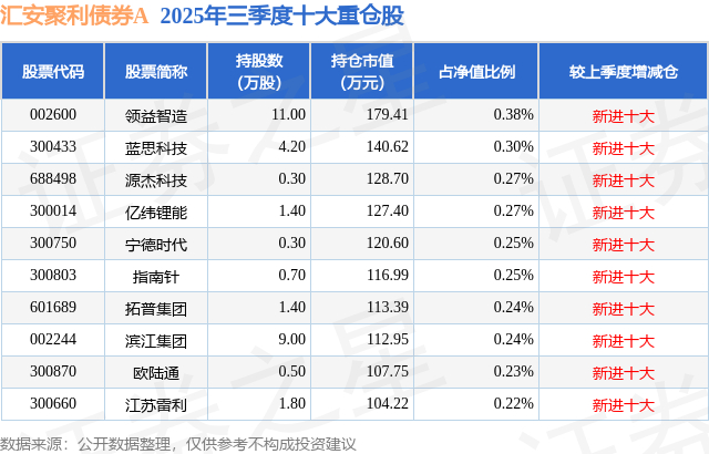 根据2025基金Q3季报公募基金重仓股数据,重仓该股的公募基金共1家,其中持有数量最多的公募基金为汇安基金的汇安聚利债券A。汇安聚利债券A目前规模为2.36亿元,最新净值1.0021(11月3日),较上一交易日上涨0.04%。该公募基金现任基金经理为张昆 柳预才。张昆在任的基金产品包括:汇安恒利39个月定开纯债债券,管理时间为2020年12月23日至今,期间收益率为7.9%;汇安盛鑫三年定开纯债债券,管理时间为2021年1月12日至今,期间收益率为13.55%;汇安裕同纯债债券A,管理时间为2022年6月22日至今,期间收益率为12.02%;汇安信泰稳健一年持有期混合A,管理时间为2024年3月26日至今,期间收益率为5.68%。柳预才在任的基金产品包括:汇安宜创量化精选混合A,管理时间为2020年12月30日至今,期间收益率为19.73%;汇安中证500增强A,管理时间为2022年12月23日至今,期间收益率为32.91%;汇安多因子混合A,管理时间为2023年5月29日至今,期间收益率为38.05%;汇安多策略混合A,管理时间为2023年6月6日至今,期间收益率为50.67%。