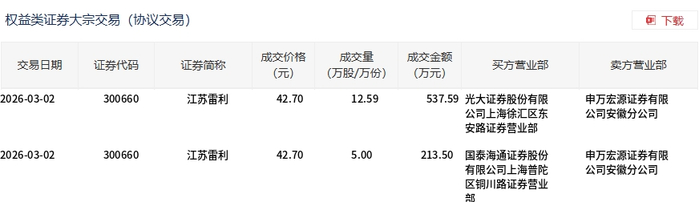 3月2日,江苏雷利大宗交易成交17.59万股,成交额751.09万元,占当日总成交额的1.99%,成交价42.7元,较市场收盘价49.9元折价14.43%。