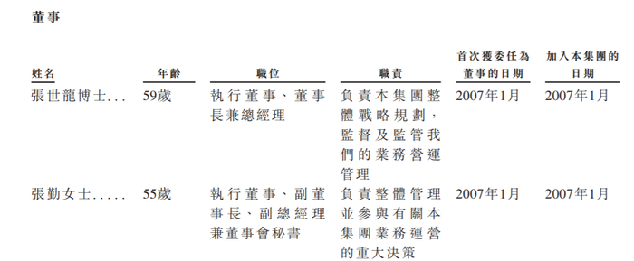 张勤,55岁,自2007年1月至今先后担任公司董事、副董事长,同时兼任公司副总经理。亦自2012年4月起担任董事会秘书。张勤主要协助张世龙博士进行整体管理及参与集团业务营运的重大决策。
