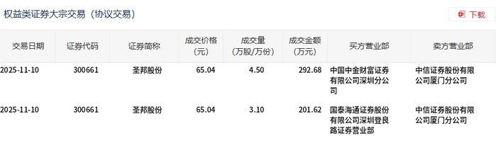 11月10日,圣邦股份大宗交易成交7.6万股,成交额494.3万元,占当日总成交额的0.69%,成交价65.04元,较市场收盘价71.47元折价9%。