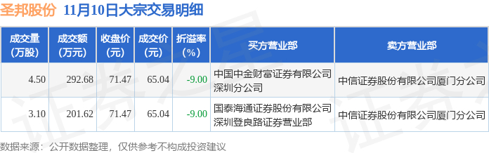 证券之星消息,11月10日圣邦股份发生大宗交易,交易数据如下: