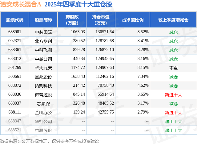 根据2025基金年报公募基金重仓股数据,重仓该股的公募基金共24家,其中持有数量最多的公募基金为诺安基金的诺安成长混合A。诺安成长混合A目前规模为141.02亿元,最新净值1.906(3月13日),较上一交易日下跌1.45%,近一年上涨29.05%。该公募基金现任基金经理为刘慧影。刘慧影在任的基金产品包括:诺安优化配置混合A,管理时间为2022年8月3日至今,期间收益率为71.68%;诺安积极回报混合A,管理时间为2023年9月29日至今,期间收益率为21.33%。