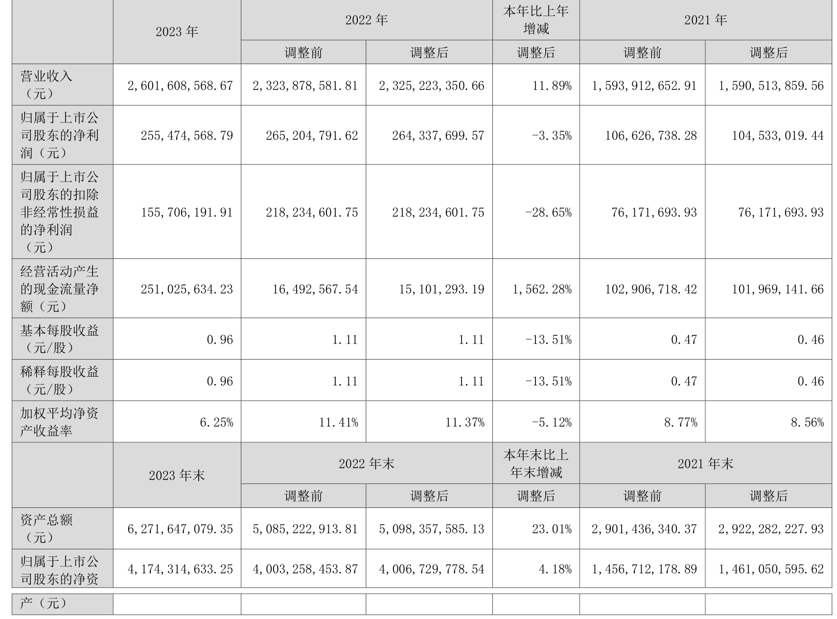 2023年,公司经营活动现金流净额为2.51亿元,同比增长1562.28%;筹资活动现金流净额4.13亿元,同比减少12.14亿元;投资活动现金流净额-10.26亿元,上年同期为-8.47亿元。