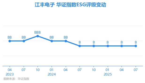 日前,华证指数公布了新一期(2025年7月31日)的ESG评级结果,江丰电子(300666.SZ)获得B评级(华证指数评级为C起至AAA九档,C为最低档,AAA为其最高一级评级/AA为其第二档),上一期(2025年4月30日)ESG评级为B。本期ESG评级在529家电子设备、仪器和元件行业A股上市公司中排名第376(上一期排名第376)。