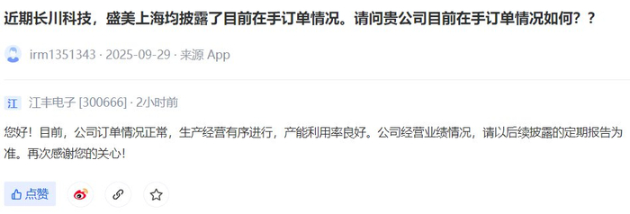 【V观财报|江丰电子:目前订单情况正常 产能利用率良好】江丰电子10月17日在投资者互动平台表示,目前,公司订单情况正常,生产经营有序进行,产能利用率良好。(