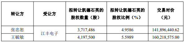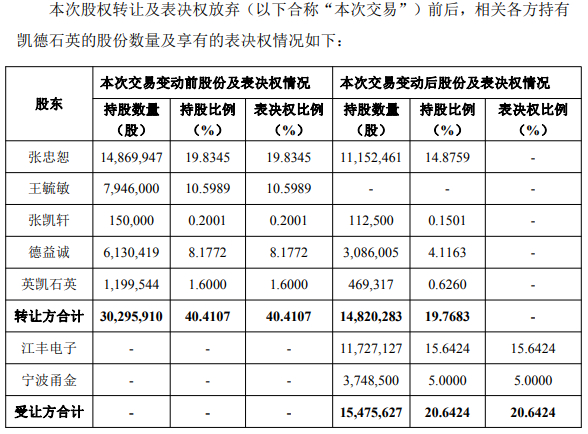 同时,江丰电子与转让方约定,张忠恕、张凯轩、德益诚及英凯石英同意放弃其持有的凯德石英全部剩余股份14,820,283股(占凯德石英总股本19.7683%)的表决权,放弃期限至转让方及其一致行动人合计所持有的凯德石英股份比例低于凯德石英总股本5%之日为止。
