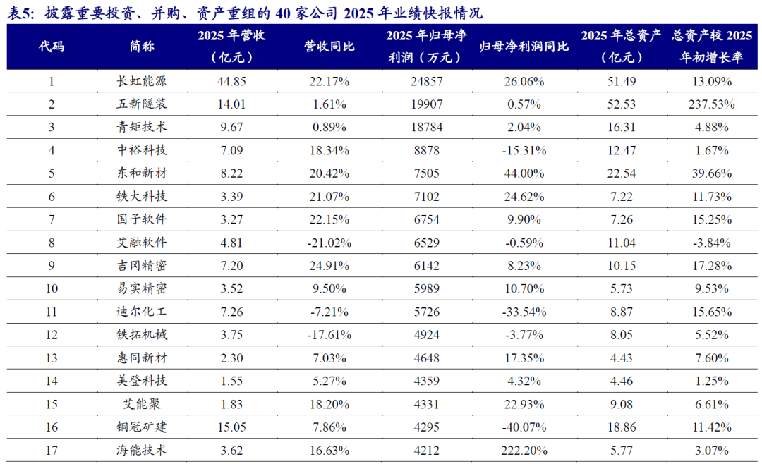汇总已经披露重要投资、并购、资产重组的40家公司2025年业绩快报情况,24家公司营业收入增长,占比60%;36家公司实现盈利,盈利面90%;34家公司总资产实现增长,占比85%。